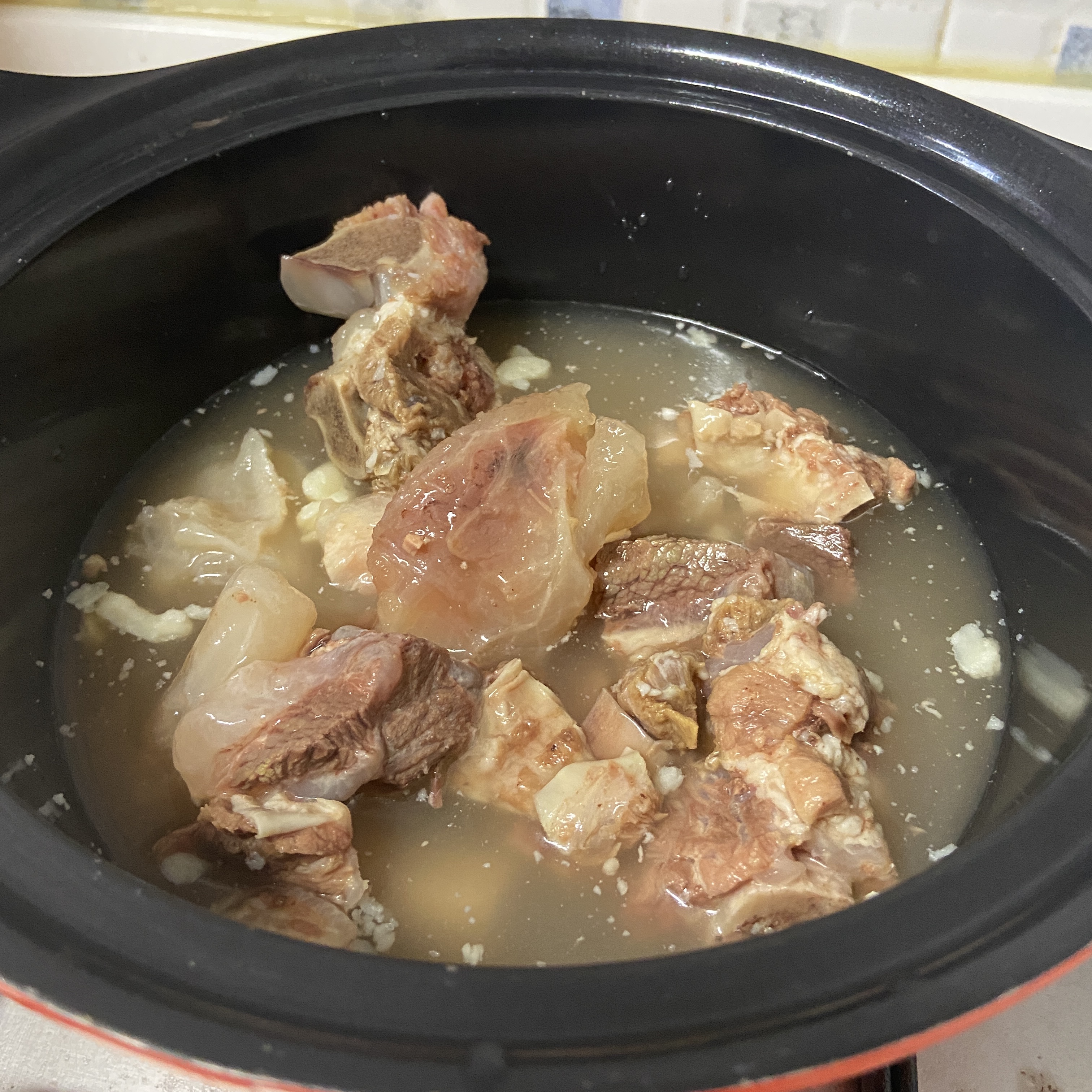 소의 부위별로 건져서 보여드릴게요. 가장 왼쪽에 뼈가 붙어있는 것이 갈비입니다. 익숙한 비주얼이죠. 그리고 가운데 있는 것이 우건(소 스지)입니다. 소의 힘줄 부분이고요, 도가니와 비슷한 맛과 식감입니다. 가장 오른쪽은 소 볼살입니다. 단단한 식감처럼 보였지만, 먹으니까 사르르르 녹더라고요.