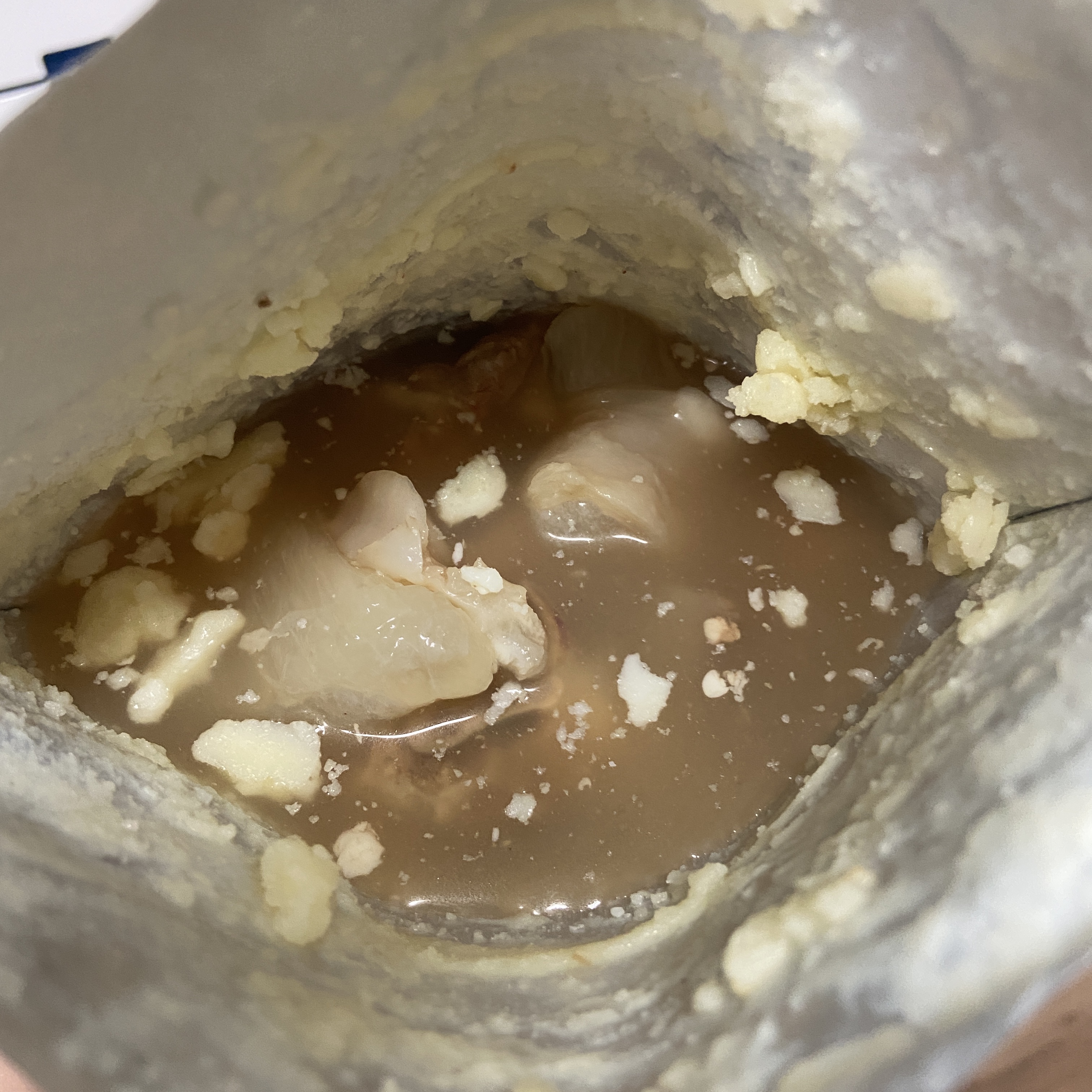 2. 냄비에 넣고 끓입니다. 끓으면서 조금씩 굳어있었던 우지방과 젤라틴이 녹는 것을 볼 수 있습니다. 안에 소고기 건더기가 꽤 많은 것을 알 수 있습니다.