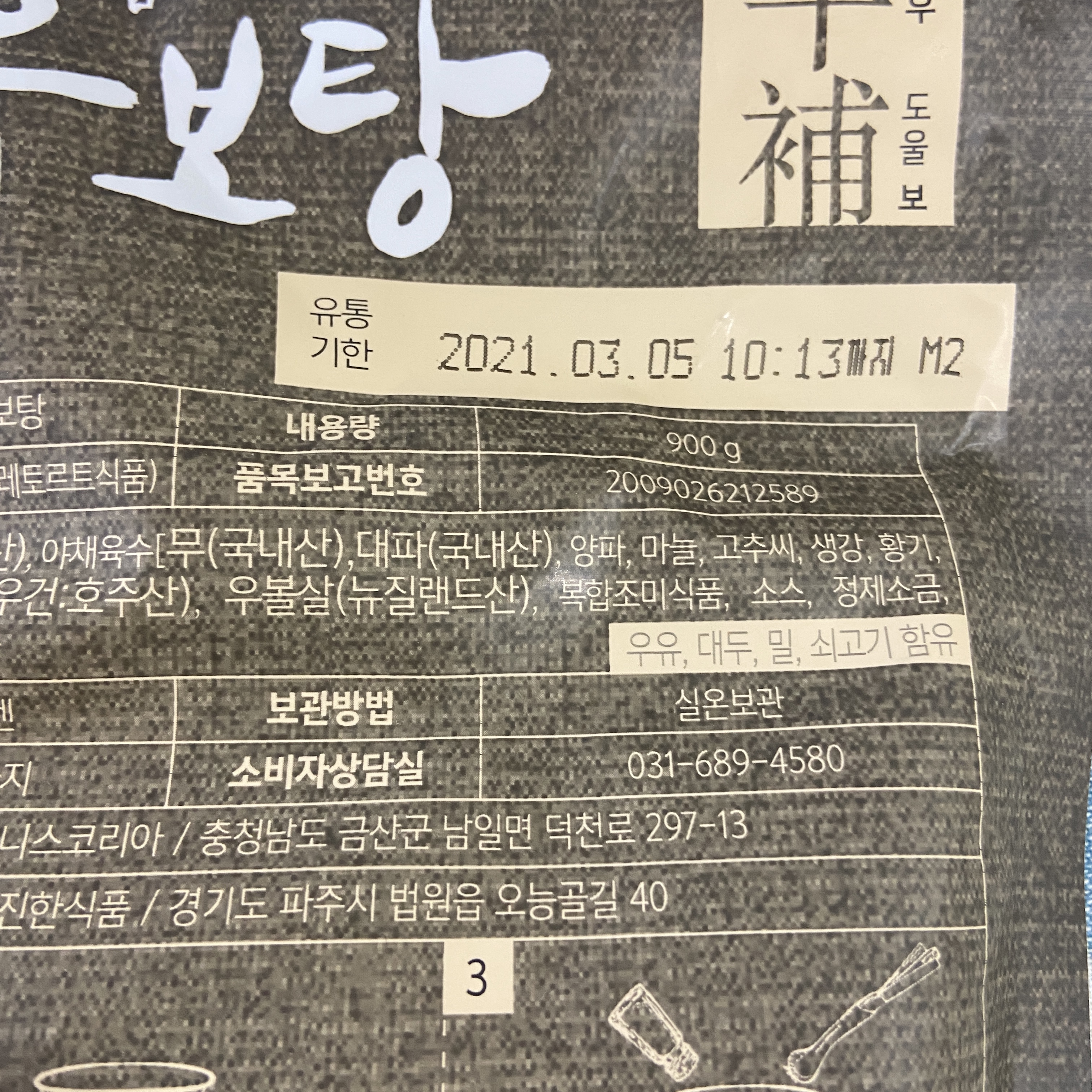 유통 기한 아래쪽에는 제품명과 식품유형, 원재료명 등 제품에 대한 상세 정보가 적혀있었습니다. 원재료 부분만 확인해보겠습니다. 소의 완산지는 우 갈비(미국산), 소스지(우건:호주산), 우 볼살(뉴질랜드산)이었습니다. 그 외에 야채 육수(국내산), 대파(국내산) 양파, 마늘 등이 첨가된 것을 알 수 있었습니다.
